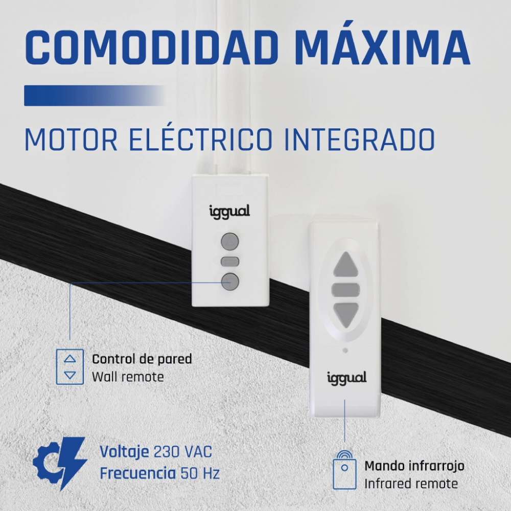 - Incluye control de pared y mando remoto infrarrojo (IR)
